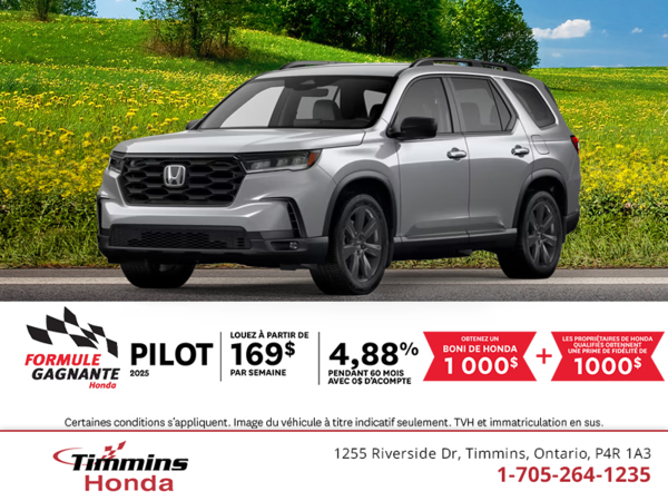 L'offre d'achat au comptant est basée sur le modèle 2025 HONDA Pilot SPORT TI (YG1H3SE 2a3b21369f5a), avec moteur 3,5L 6 cyl. et transmission Automatique 10 vitesses. Le prix de vente à l'achat au comptant est de 53 828,63 $ (plus taxes). Le prix de vente (53 828,63 $) à l'achat au comptant inclut les rabais: Rabais Achat Comptant (3 000,00 $). Le prix de vente 53 828,63 $ à l'achat au comptant inclut: PDSF (53 650,00 $), Transport et Préparation (2 000,00 $), Frais de concessionnaire (688,00 $), Taxe d'accise sur le climatiseur (100,00 $), Taxe sur les pneus (22,50 $), Frais OMVIC (22,00 $), Frais environnementaux (1,00 $). L'offre de financement est basée sur le modèle 2025 HONDA Pilot SPORT TI (YG1H3SE 2a3b21369f5a), avec moteur 3,5L 6 cyl. et transmission Automatique 10 vitesses. Les taxes applicables sont calculées sur le montant total avant déduction de l'acompte. Le prix de vente en financement est de 56 483,50 $ (taxes en sus). Les paiements en financement incluent: MSRP (53 650,00 $), 53 650,00 $), Transport et Préparation (2 000,00 $), Frais de concessionnaire (688,00 $), Taxe d'accise sur le climatiseur (100,00 $), RDPRM (65,61 $), Taxe sur les pneus (22,50 $), Frais OMVIC (22,00 $), Frais environnementaux (1,00 $). L'offre de financement est basée sur un terme de 84 mois avec un taux d'intérêt de 4,98%. Les 364 paiements à la semaine de 184,05 $ (207,98 $ taxes incluses) incluent un acompte de 0,00 $ et un échange net de 0,00 $. Les acomptes sont dus à la livraison du véhicule. Les crédits de taxes pour l'échange sont soumis à une preuve de propriété. L’obligation totale en financement est de 75 704,72 $ (taxes comprises). L'offre de location est basée sur le modèle 2025 HONDA Pilot SPORT TI (YG1H3SE 2a3b21369f5a), avec moteur 3,5L 6 cyl. et transmission Automatique 10 vitesses. Les taxes sur le comptant initial et les rabais après taxes (incluant les rabais du gouvernement) sont exclues et doivent être payées à la livraison. Le prix de vente en location est de 56 538,31 $ (taxes en sus). Les paiements en location incluent: MSRP (53 650,00 $), Transport et Préparation (2 000,00 $), Frais de concessionnaire (688,00 $), Taxe d'accise sur le climatiseur (100,00 $), RDPRM (54,81 $), Taxe sur les pneus (22,50 $), Frais OMVIC (22,00 $), Frais environnementaux (1,00 $). L'offre de location est basée sur un terme de 60 mois avec un taux d'intérêt de 4,88%. Les 260 paiements à la semaine de 174,30 $ (196,96 $ taxes incluses) incluent un acompte de 0,00 $ et un échange net de 0,00 $. Les acomptes sont dus à la livraison du véhicule. L'acompte de 0,00 $ et la taxe sur l'acompte, l'échange net de 0,00 $ et le premier paiement de 196,96 $ sont dûs au début du bail. Le montant total dû au début du bail est 196,96 $ (Acompte de 0,00 $, Premier paiement (196,96 $) et (TVH) 0,00 $). Les crédits de taxes pour l'échange sont soumis à une preuve de propriété. L'offre de location est basé sur un plan de kilométrage de 20000 km par année. Des frais de 0,15 $ par kilomètre supplémentaire seront applicables. La valeur résiduelle estimée est de 20 806,50 $. Une option d'achat à la fin de la location pourrait être disponible (Valeur de Rachat) au montant de 20 806,50 $. Un dépôt de sécurité pourrait être requis. L’obligation totale en location est de 51 209,60 $ (taxes comprises). Immatriculation, assurance, enregistrement, options additionnelles et taxes applicables sont en sus. Les détails de prix sont à titre informatif seulement et ne sont pas destinés à être une offre d'achat. Les montants indiqués n'incluent pas les frais d'immatriculation, l'enregistrement, l'assurance et certains autres frais (par exemple, les produits ou services facultatifs mis à votre disposition).